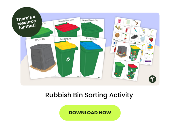 After reading, why not show your students where the rubbish bins are in the classroom and chat about what goes in each one? Then, try a whole-class sorting activity where students decide which materials can be recycled, composted, or thrown away properly.
