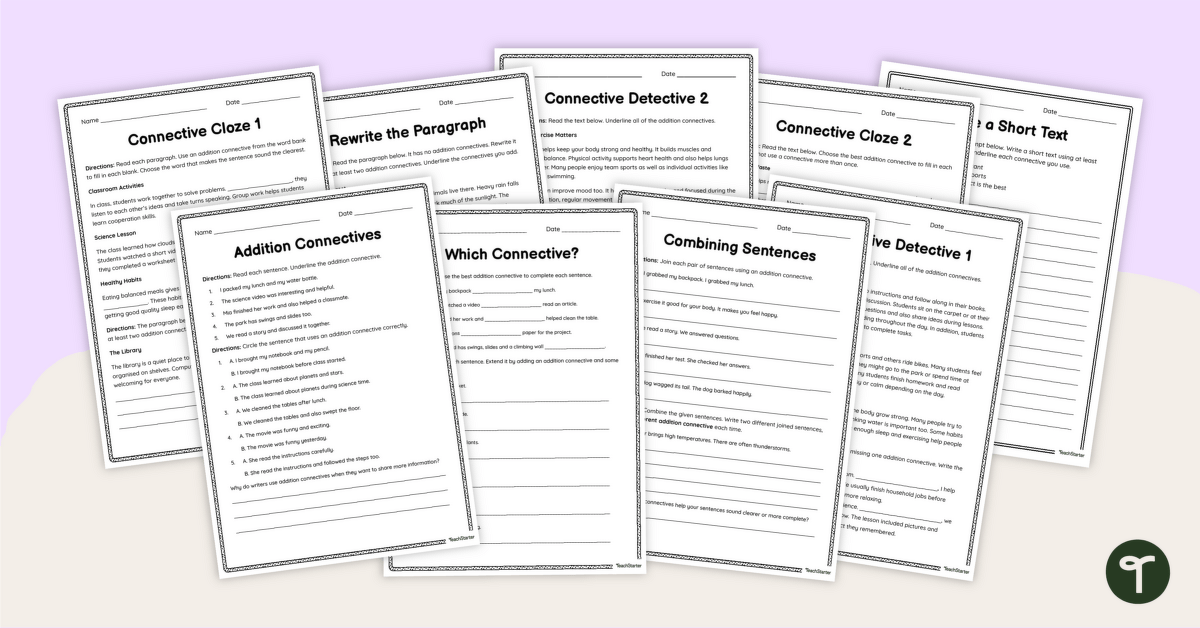 This worksheet pack has been designed by the Teach Starter team to teach your students how addition connectives can be used across a range of text types. The pack includes 9 scaffolded worksheets that progress from simple sentences to short paragraphs to longer texts. This makes them perfect for differentiation purposes!