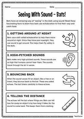 - Comprehension Sheet – A double-sided passage packed with key information about bats and how they use echolocation to survive, followed by guided questions to check understanding.