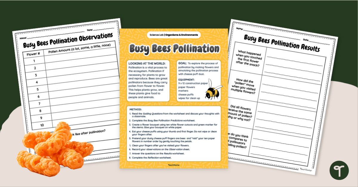 Looking for a fun and educational way to bring plant science to life? This printable pollinator activity resource is designed for early primary school students to explore the process of pollination through an exciting hands-on simulation. By pretending to be bees and using cheese puff dust as pollen, students will experience how pollinators transfer pollen from flower to flower.