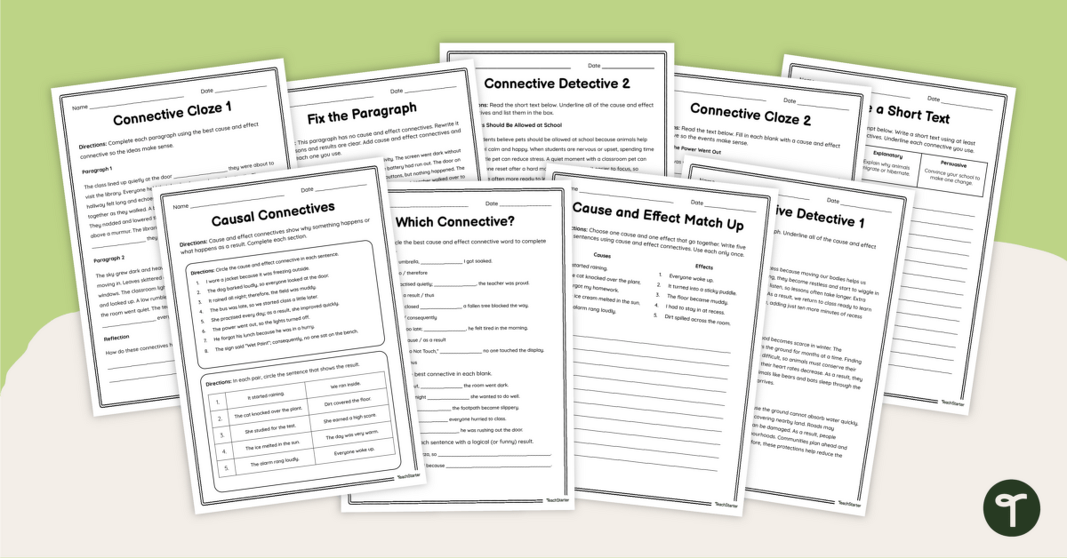 This causal connectives worksheet pack has been designed by the Teach Starter team to support your students in identifying and using these useful parts of speech. The pack features nine unique worksheets that progressively build understanding. Starting with simple single-sentence activities, students build their confidence before moving on to short paragraphs and eventually complete passages of text