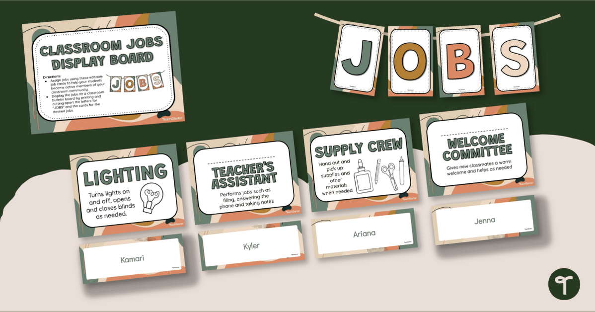 - Create a permanent display with the Classroom Helper cards, and use push pins to attach student names next to job titles.