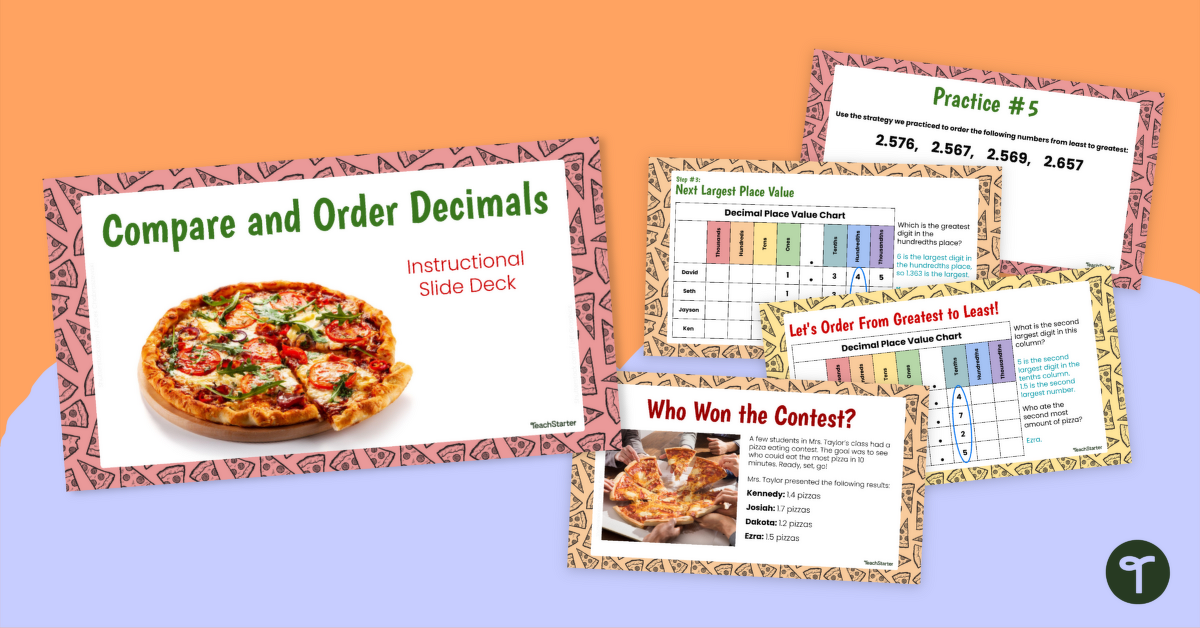 Use our pizza-themed comparing and ordering decimals teaching slides to teach your students to compare and order decimals to the thousandths place using a place value chart.