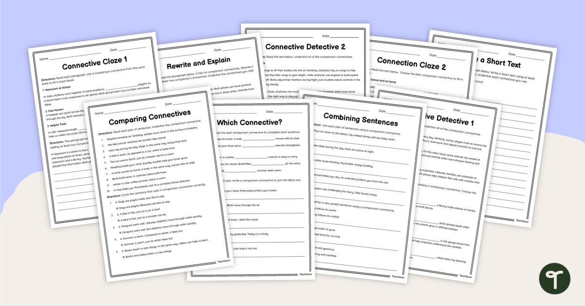 This worksheet pack has been created by the Teach Starter team to help your students use comparative connectives in texts such as narratives, information reports and persuasive texts. This resource includes nine thoughtfully sequenced worksheets that guide students from simple sentence-level activities to longer paragraphs and extended passages. This helps students to build up their confidence with comparative connectives step by step.