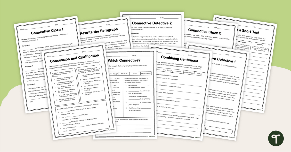 Teach concession words with this set of 9 progressive worksheets designed to help your students link ideas within and across sentences.