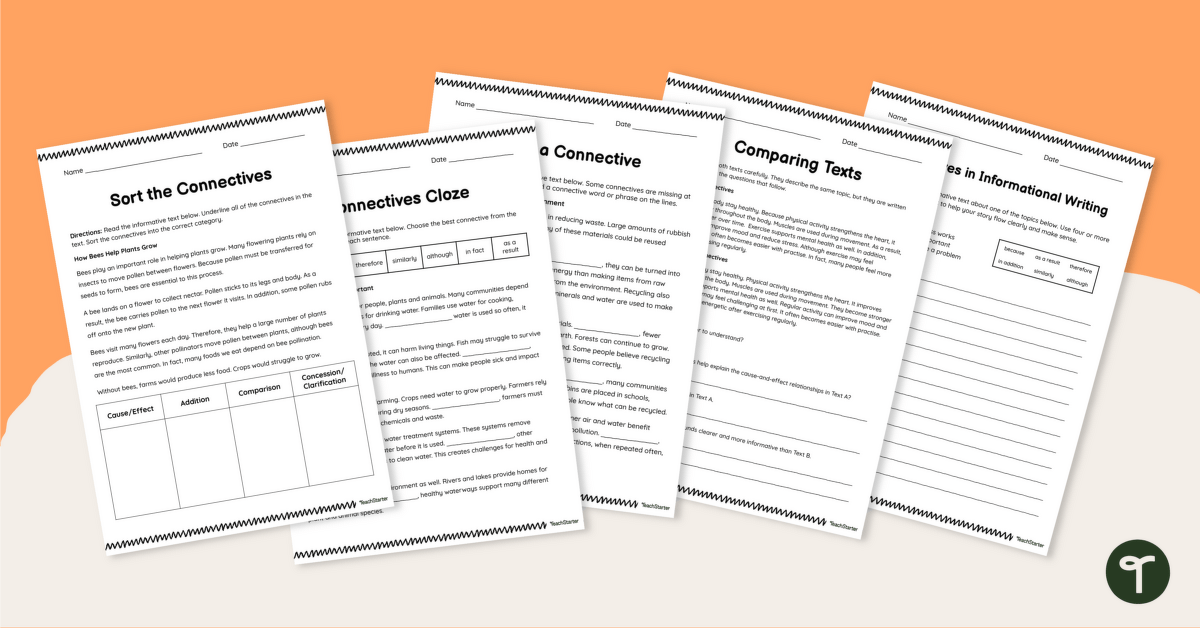 This set of five activity worksheets has been created by our team to build your students’ understanding of how connection words are used in informative writing. Each worksheet contains a different activity to help students explore how connection words bring clarity and structure to factual texts. Activities include: