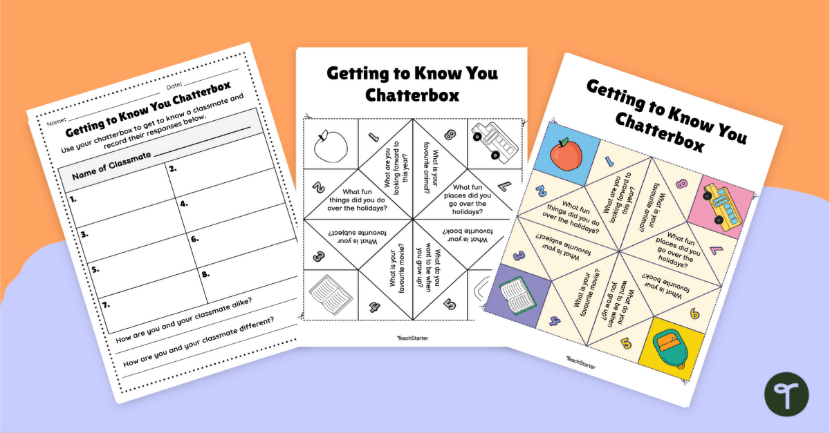 Use this getting to know you chatterbox template and summary sheet as a first day of school activity.