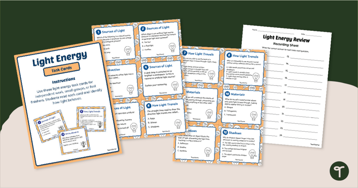 Review or assess student knowledge of light energy with a set of printable Light Energy Task Cards.