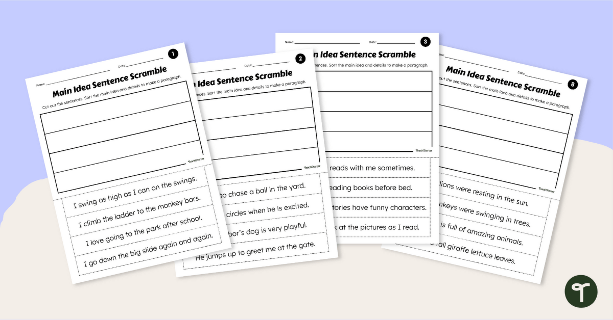 These main idea cut and paste worksheets are designed to help Year 2 students clearly understand the difference between a main idea and supporting details in a paragraph. Using hands‑on learning, students cut and paste four sentences to build a simple paragraph structure, placing the main idea at the top and the three detail sentences underneath.