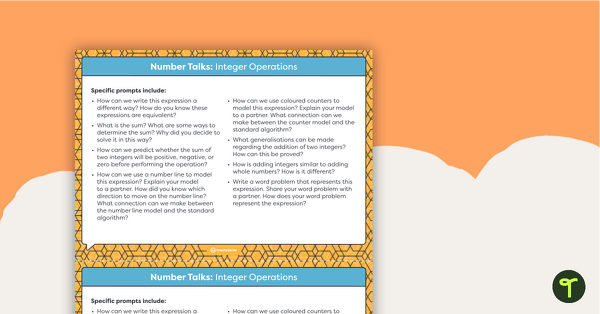 Number talks are meant to be short, daily maths activities that allow students to have meaningful and highly engaging conversations about maths. Simply show students the front of the card, and ask the prompts on the back. These exchanges will lead to the development of more accurate, efficient and flexible strategies for students.