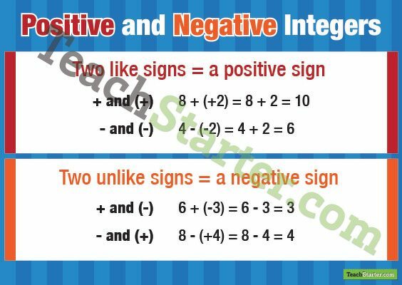 Positive and negative integers are a difficult concept, especially when you need to add and subtract them. This poster shows what happens when the signs are the same and when they are different.