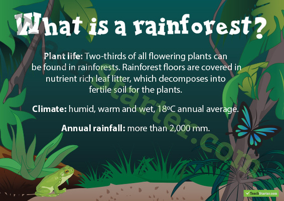A poster with information about the plant life, climate and annual rainfall that characterise a rainforest environment.