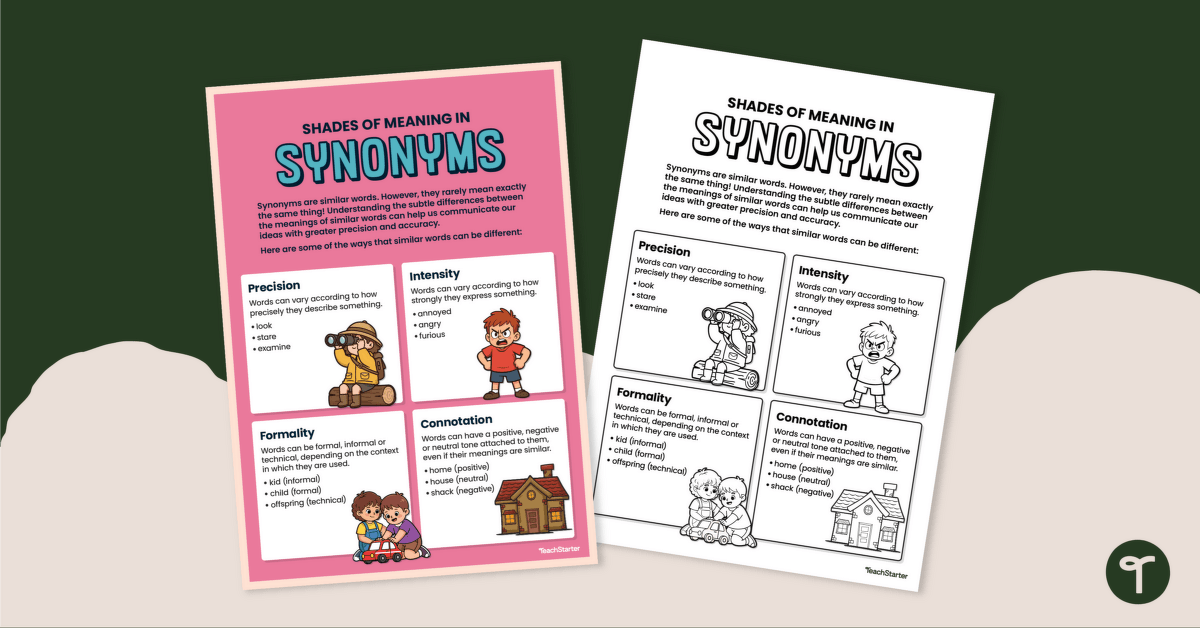 This poster from Teach Starter has been designed to make those subtle differences clear to students. It explains how synonyms can vary in precision, accuracy, formality and connotation, giving students a shared language they can use when discussing word choice. The poster contains examples of each category to help make this abstract concept more concrete for students.