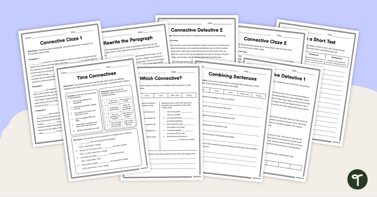 This time connectives worksheet pack has been designed by the Teach Starter team to support your students in identifying and using temporal words and phrases. The pack features nine unique worksheets that progressively build understanding. Activities start with simple single-sentence exercises and advance through short paragraphs to full passages.