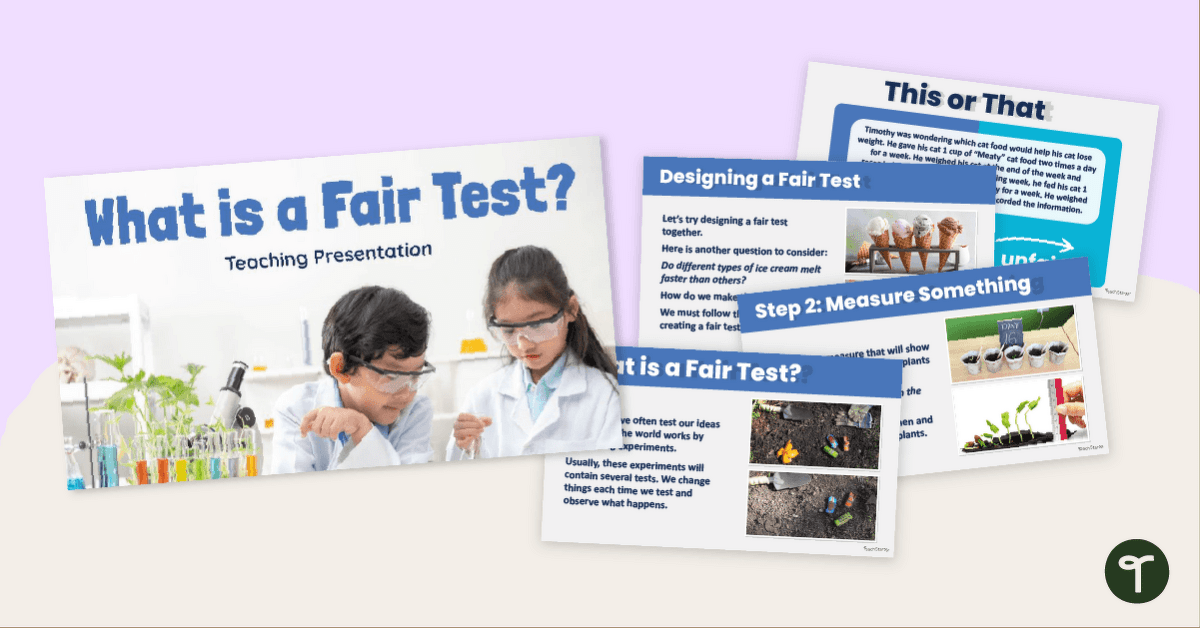 Teach your Year 3 and 4 students about fair tests with an engaging 'What is a Fair Test? Teaching Slide Presentation.