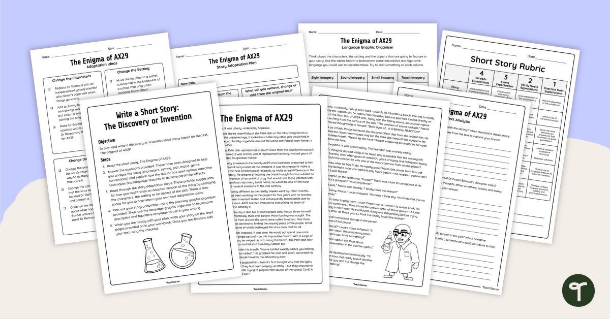 This short story writing project is designed to give your students the tools they need to succeed as writers. Using the text The Enigma of AX29 as inspiration, students will first read and analyse the story, exploring how the author uses narrative techniques and language features to create impact. Then, they’ll plan and craft their own narrative based on the sample text, adapting either the characters, the setting or the plot. This approach builds confidence and helps students develop strong storytelling skills.