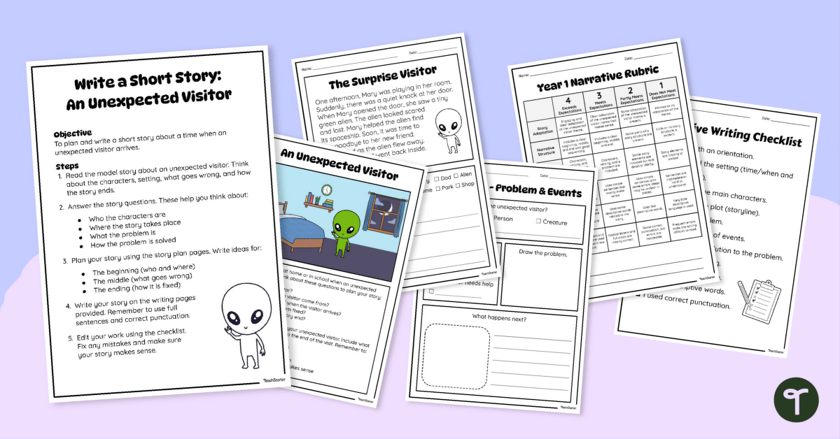 Help your students master narrative writing with this scaffolded Year 1 Narrative Writing Assessment Pack, built around an exciting “Unexpected Visitor” story theme.
