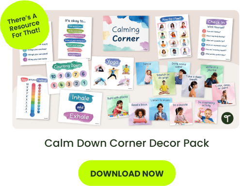 The goal of these spaces is to give students a space where they can remove themselves from the situation and recollect themselves. It also provides opportunities for diffusing a negative emotion or situation before it escalates. Providing this space to your students is a great way to help them develop their coping skills!