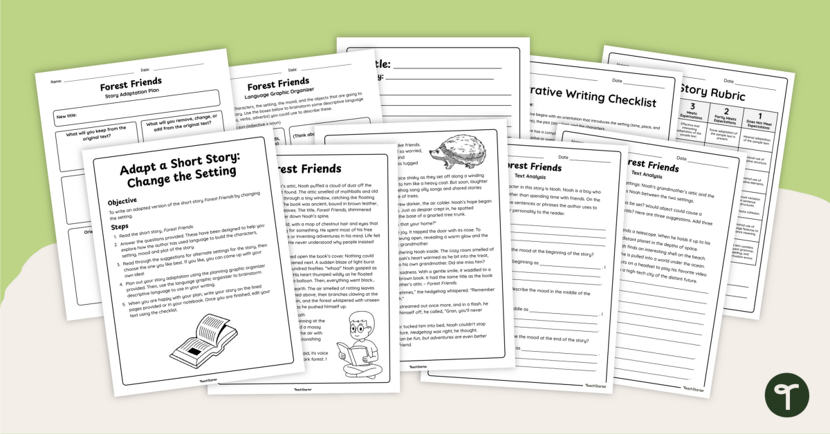 This short story writing project has been designed to support your students in understanding the importance of a narrative setting when shaping a story. To complete the project, students will read and analyze the short story, Forest Friends. They will then take a closer look at the text’s narrative elements through a series of guided questions before planning a narrative of their own that changes the narrative setting of the sample text. This resource conveniently combines reading comprehension, text analysis and creative writing in one activity.