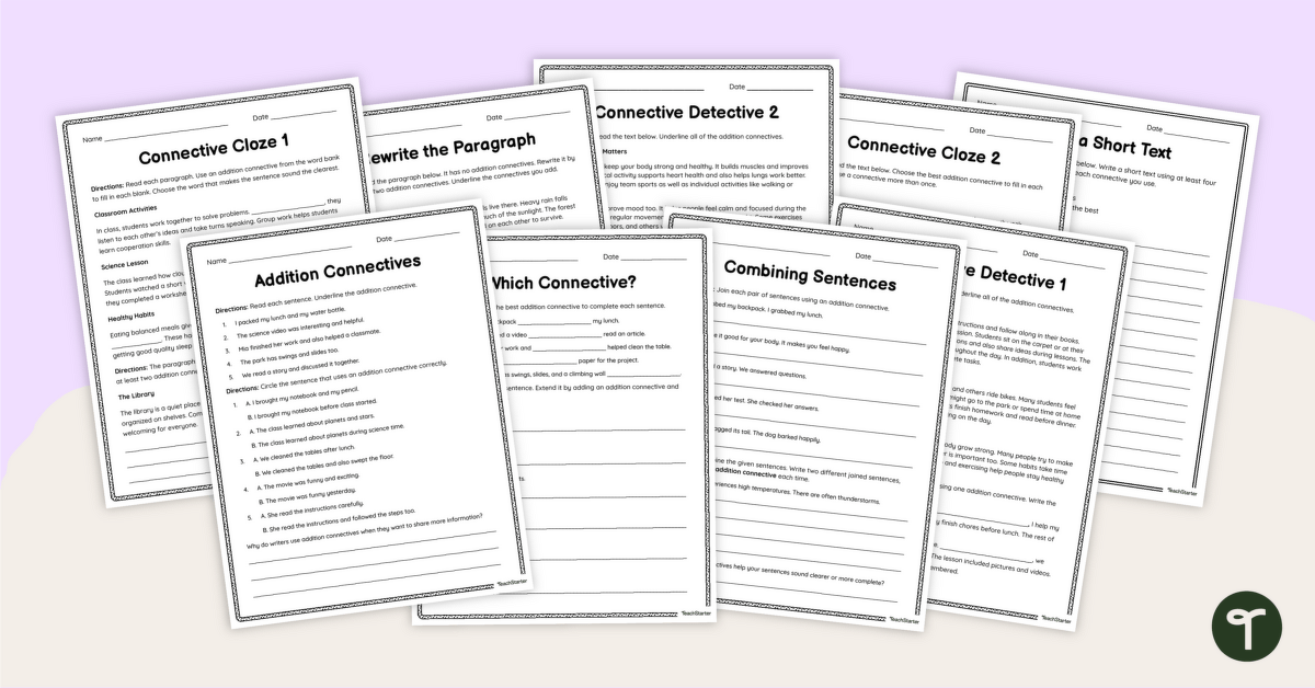 This worksheet pack has been designed by the Teach Starter team to teach your students how additive connectives can be used across a range of text types. The pack includes 9 scaffolded worksheets that progress from simple sentences to short paragraphs to longer texts. This makes them perfect for differentiation purposes!
