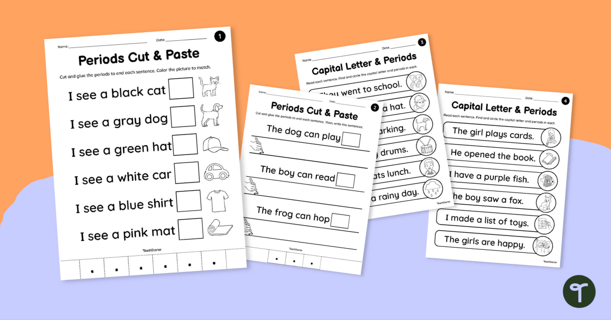Explore capital letters at the start of sentences and periods at the end with this puncutation worksheet set.