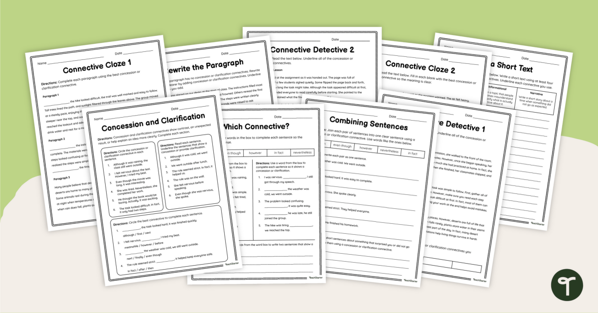 Teach concession words with this set of 9 progressive worksheets designed to help your students link ideas within and across sentences.