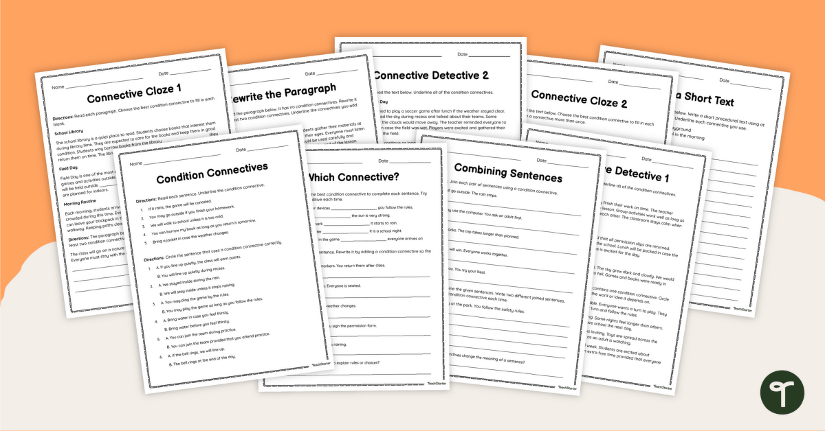 This worksheet pack has been designed by the Teach Starter team to teach your students how conditional words can be used across a range of text types. The pack includes 9 scaffolded worksheets that guide students from constructing simple conditional sentences, to shaping connected paragraphs, to analyzing and creating longer pieces of writing.