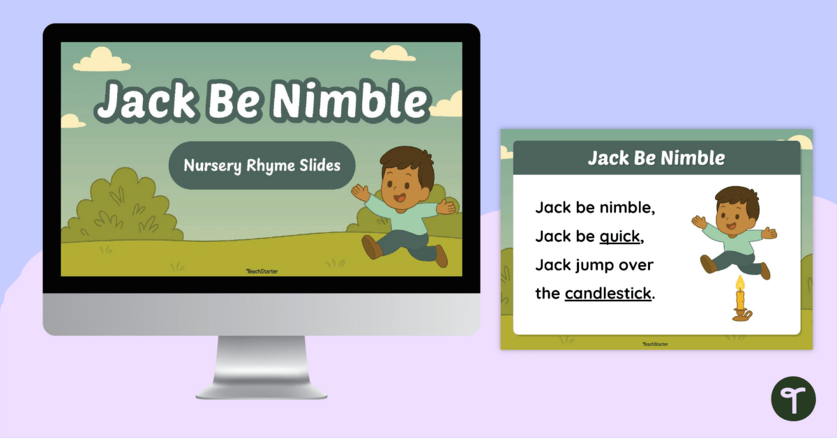 Use this “Jack be Nimble” nursery rhyme poster and PowerPoint to teach your youngest students about rhyme and rhythm.