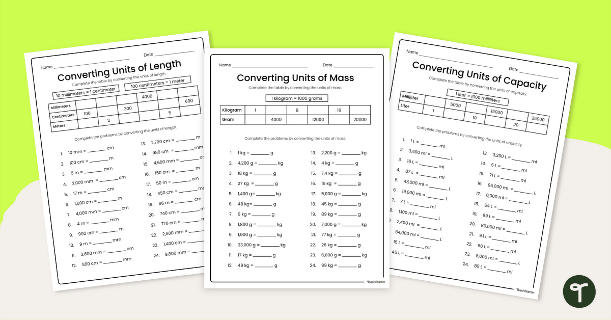 - Math Centers: Incorporate the worksheets into your math centers. Assign one worksheet to each station (length, mass, capacity) and rotate students through the stations to tackle each type of conversion.