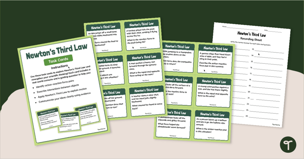 Each Newton’s Third Law task card presents a relatable situation along with a guiding question to support deeper thinking. As students work through the cards, they will: