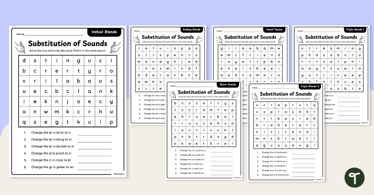 Help students manipulate phonemes with these phoneme substitution worksheets where students substitute phonemes and search for words in a word search.