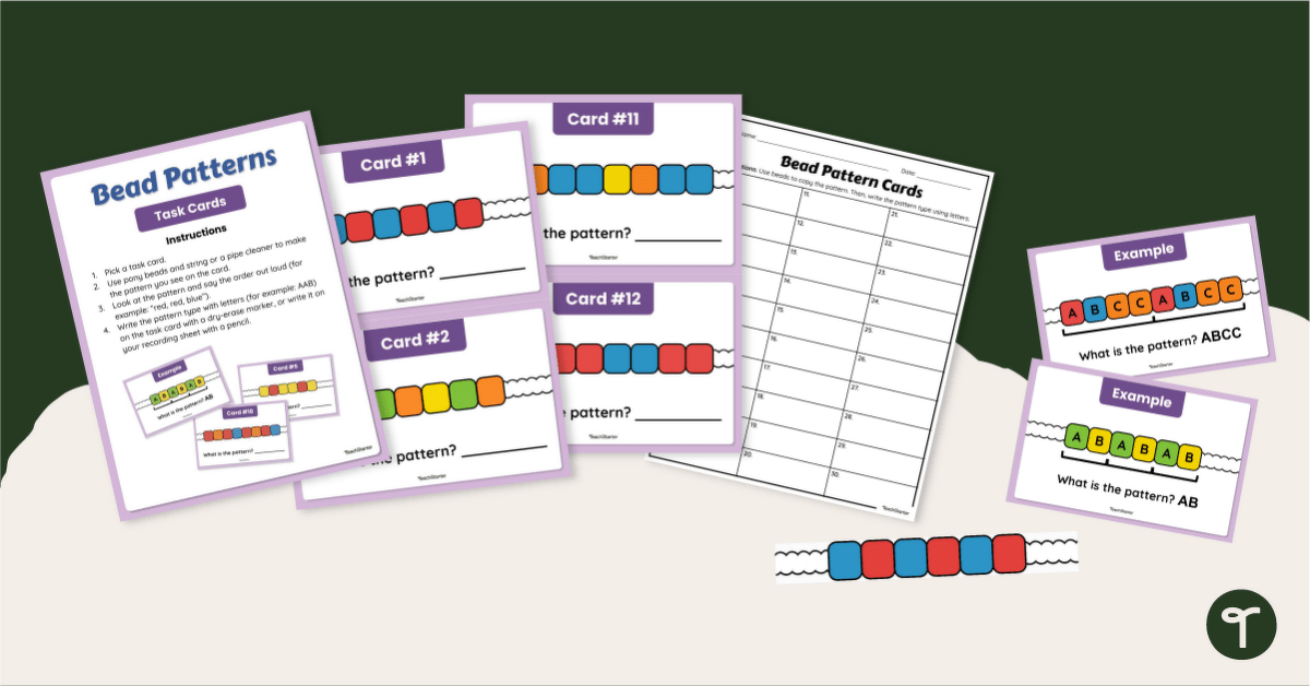 Practice recognizing, copying, and describing different repeating patterns using pony beads and our set of 30 Repeating Patterns Task Cards.