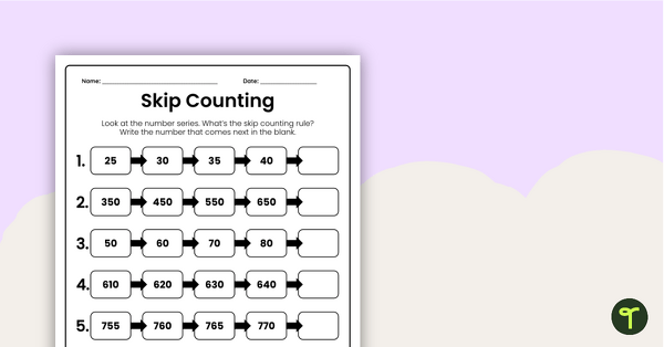 Check your students’ understanding of skip counting by increasing intervals of 5, 10, and 100 in number series, including 2- and 3- digit numbers. These worksheets require students to look at the number series, determine the skip counting rule, and complete the series by filling in the blank spaces.
